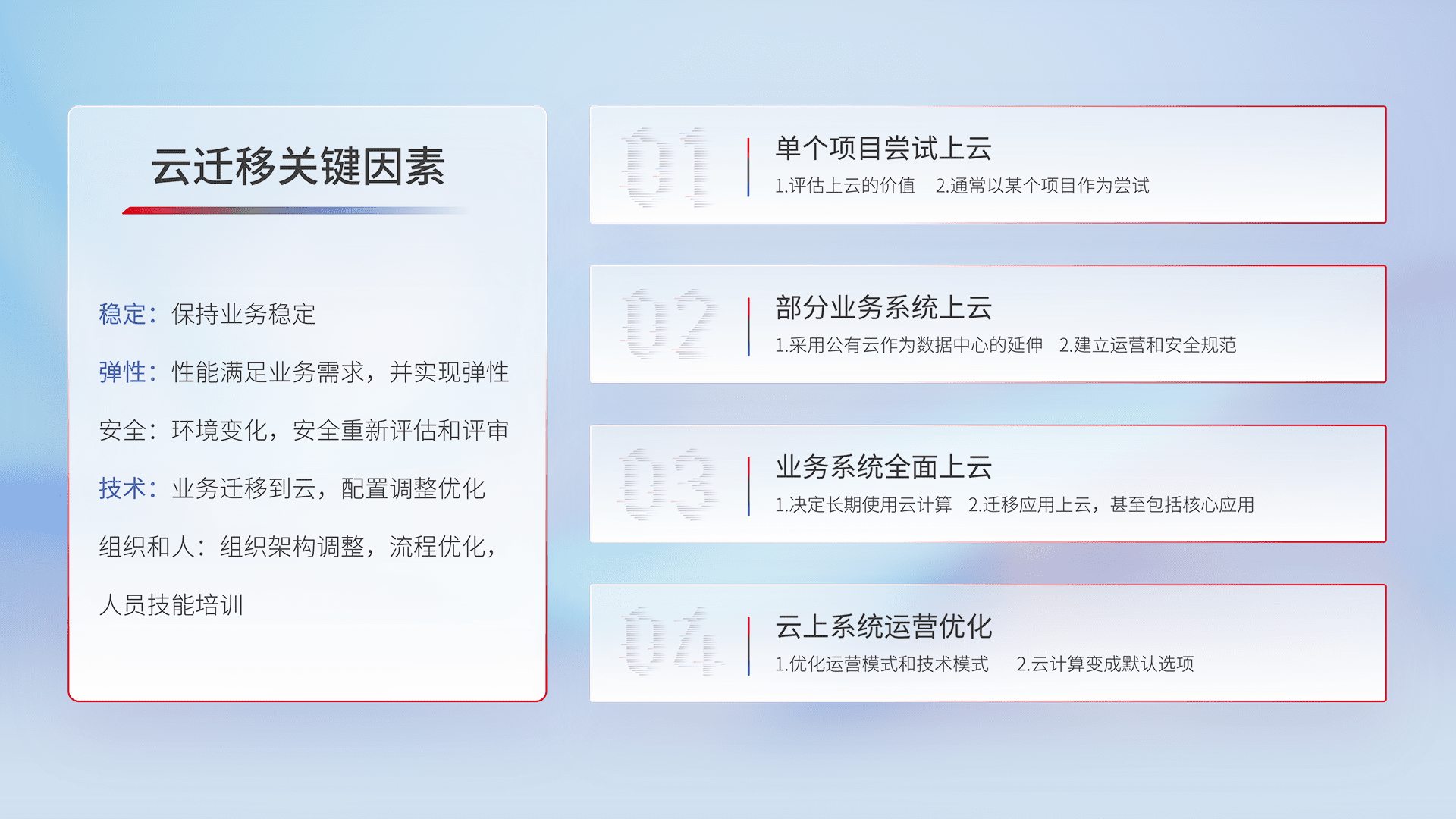 结合实际业务,,从规划设计、、云平台选型、、、、云原生改造、、、、数据迁移、、集成交付,,,,迁移全过程为客户识别最佳上云路径,,,做好风险识别管理,,,设计网络架构、、、、身份权限、、安全审计合规、、、、操作审计、、、、日志审计、、监控告警策略、、多站点容灾设计等,,对云上基础设施进行整体规划,,提升IT治理水平,,,以满足弹性、、、高可用、、、、高性能的需求。。。。