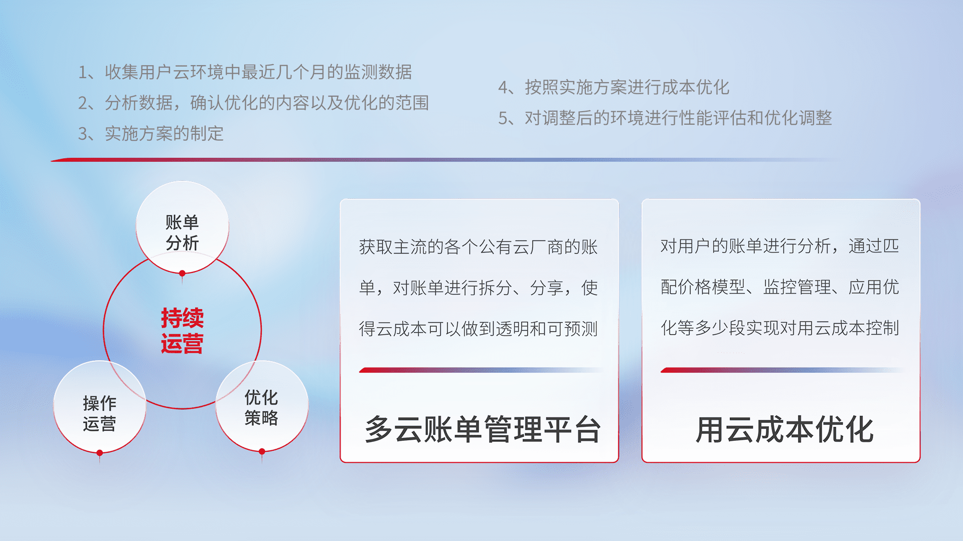 通过多云纳管,,,以统一的资源数据模型把客户的云资源进行抽象和封装,,,,进而实现对多云资源的统一操作,,,保障云资源管理的可靠性、、、、稳定性与可用性。。。。量身定制化运维内容,,,配置、、、、开发运维、、、、补丁管理、、、备份、、监控、、、、认证和访问管理、、审计和日常巡检等,,保障在用云过程中的可靠度,,,稳定度以及高可用率。。。